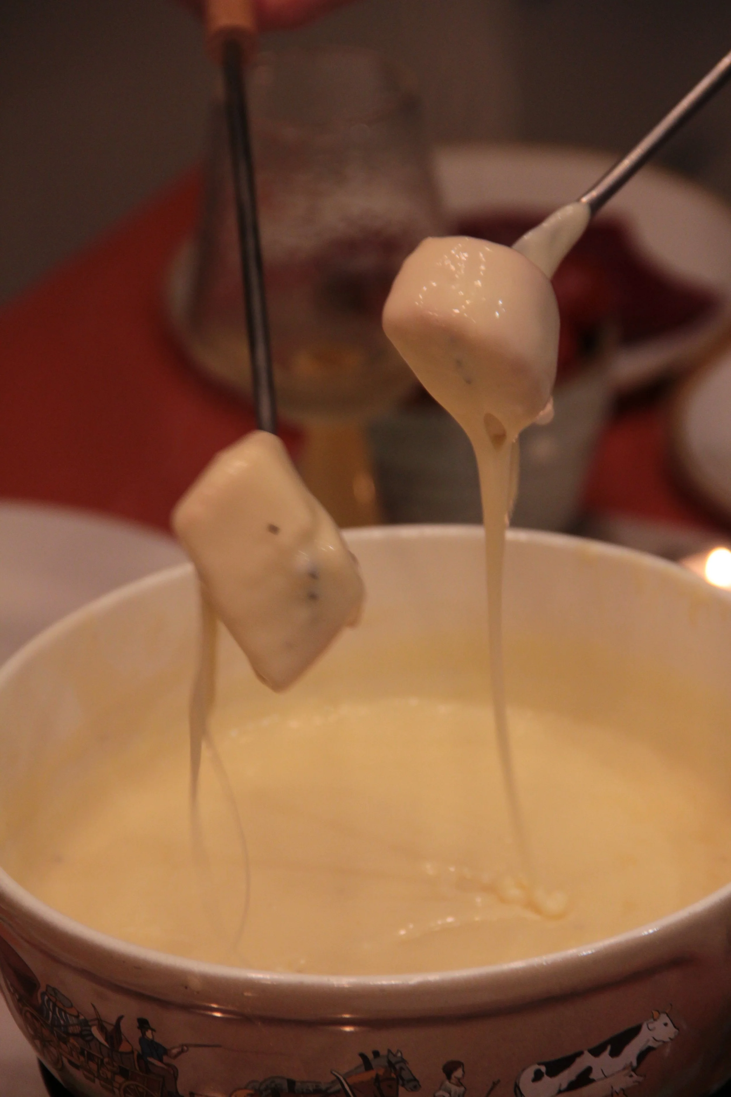 7. Je verplaatst de kaas naar de fonduepan en zorgt dat je met je brood of dergelijke over de bodem roert zodat deze niet aanbakt en smullen maar!
