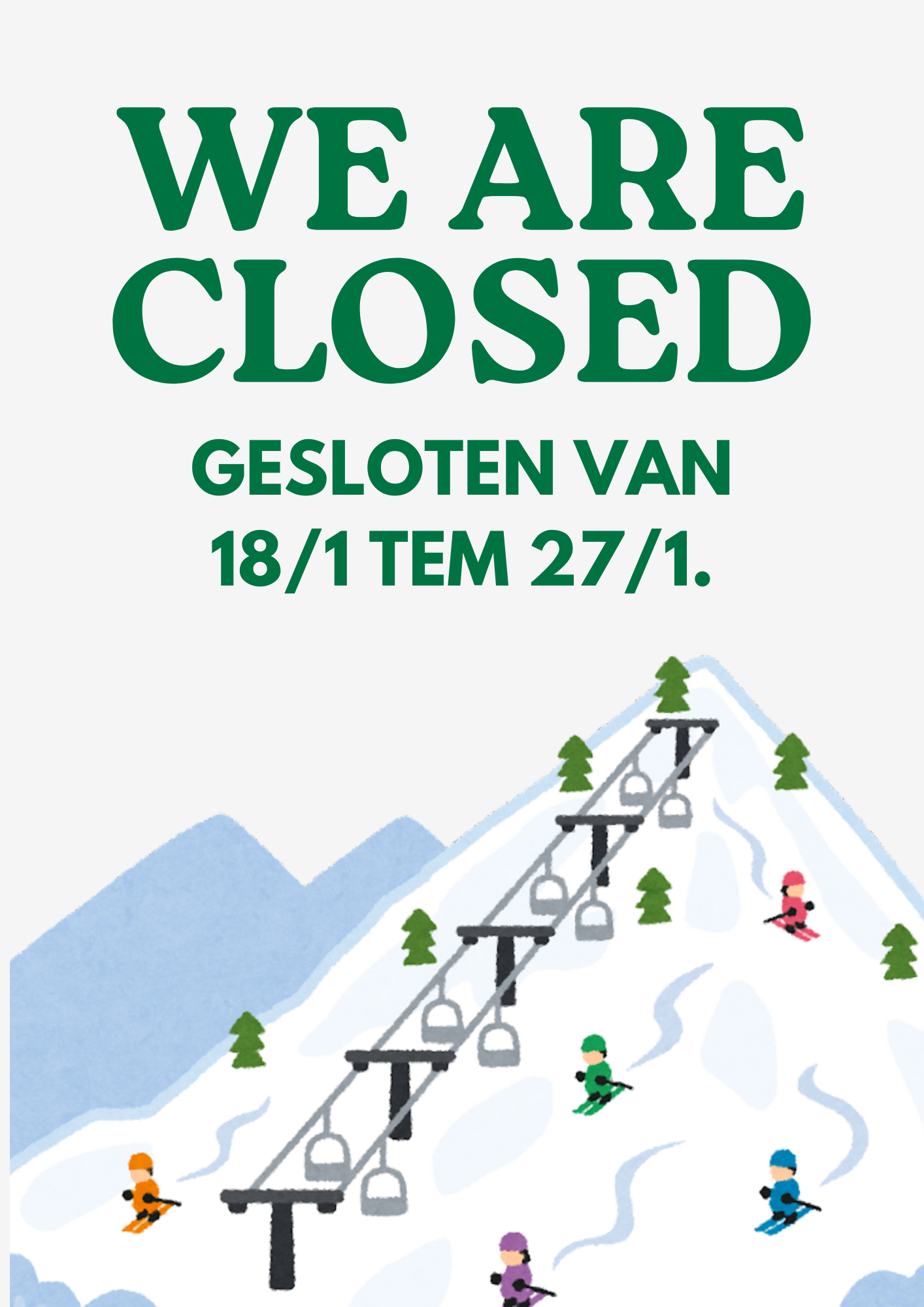 Wij nemen een week verlof van 18 tot en met 27 januari, maar niet getreurd, wie ons te hard mist kan op 25 januari naar de nieuwjaarsdrink komen van Stad Beringen, waar wij en de andere handelaars van Beringen een lekkere stand gaan uitbaten. Wij houden alvast van 14 tot 18u een raclette party! Be there or be square!